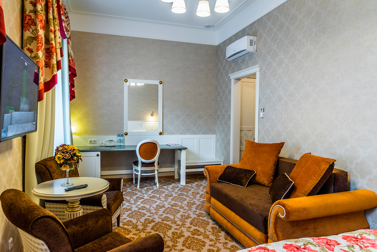 Полулюкс улучшенный, площадь номера 28 м² , две раздельные кровати (90х200 см) или одна большая кровать (180х200 см) с ортопедическим матрасом 27 см высотой, удобная рабочая зона, Wi-Fi, кондиционер, система отопления, телевизор, чайная станция, холодильник, сейф,утюг и гладильная доска. В ванной комнате установлена ванна. В некоторых номерах инсталлированы камины, установлены диваны. Вид во внутренний дворик отеля.